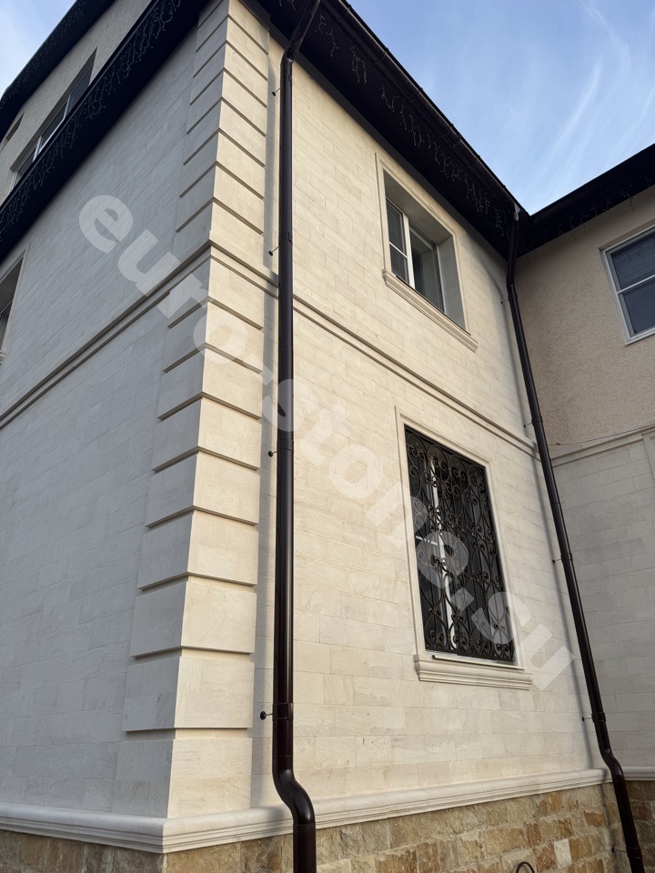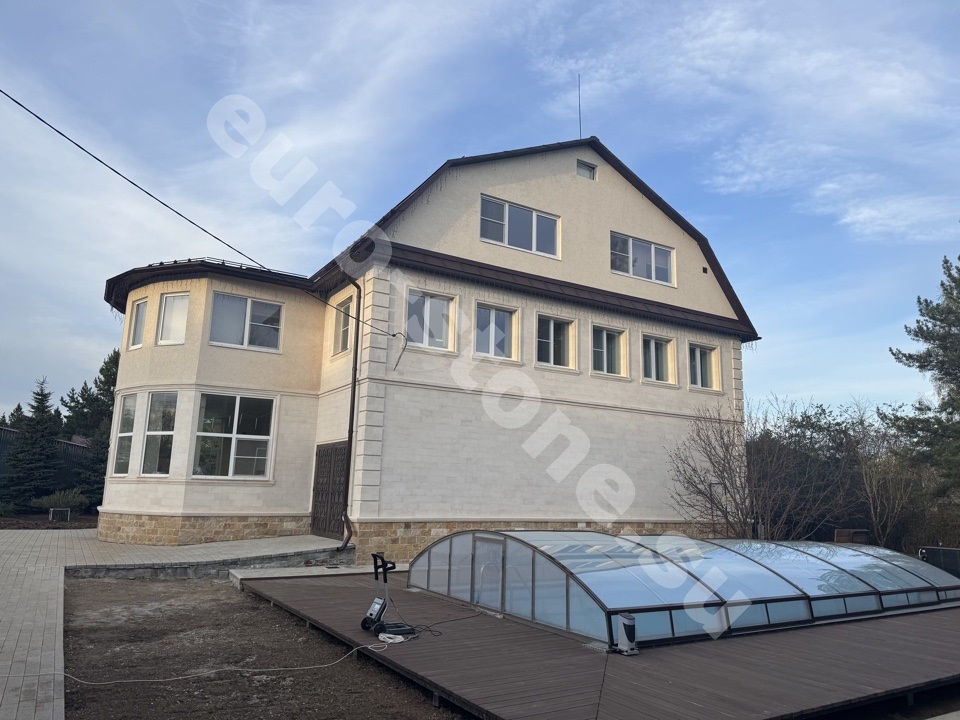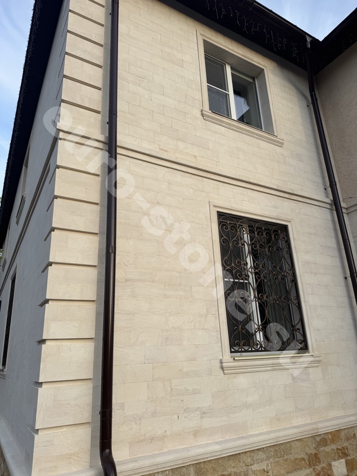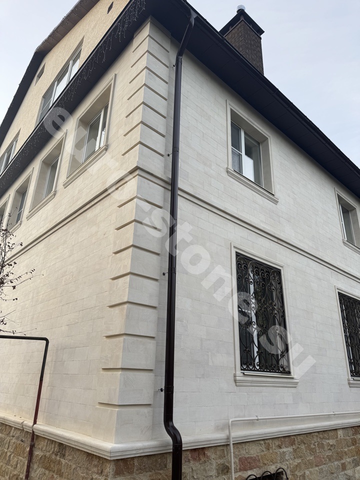 Облицовка дома бежевым известняком