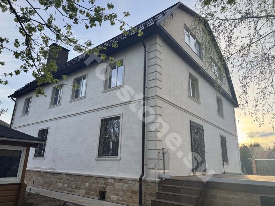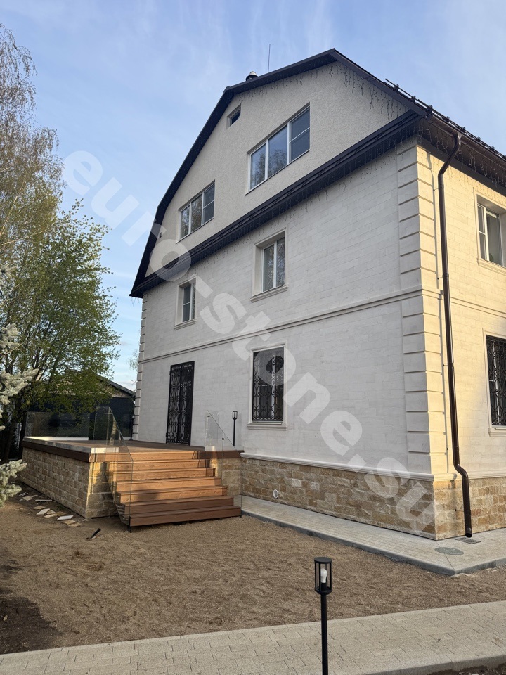 Бежевый известняк — это камень, который всегда смотрится дорого и стильно. Его теплый оттенок делает фасад уютным, а сама облицовка придает дому престиж и надежную защиту от непогоды. Такой камень выбирают для домов, которые должны оставаться красивыми и прочными десятилетиями.