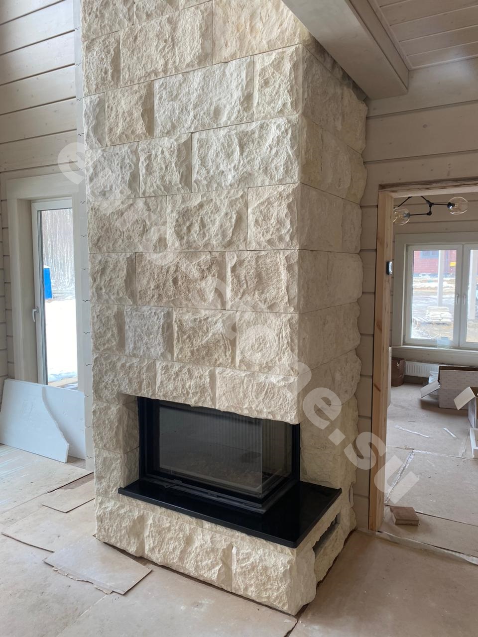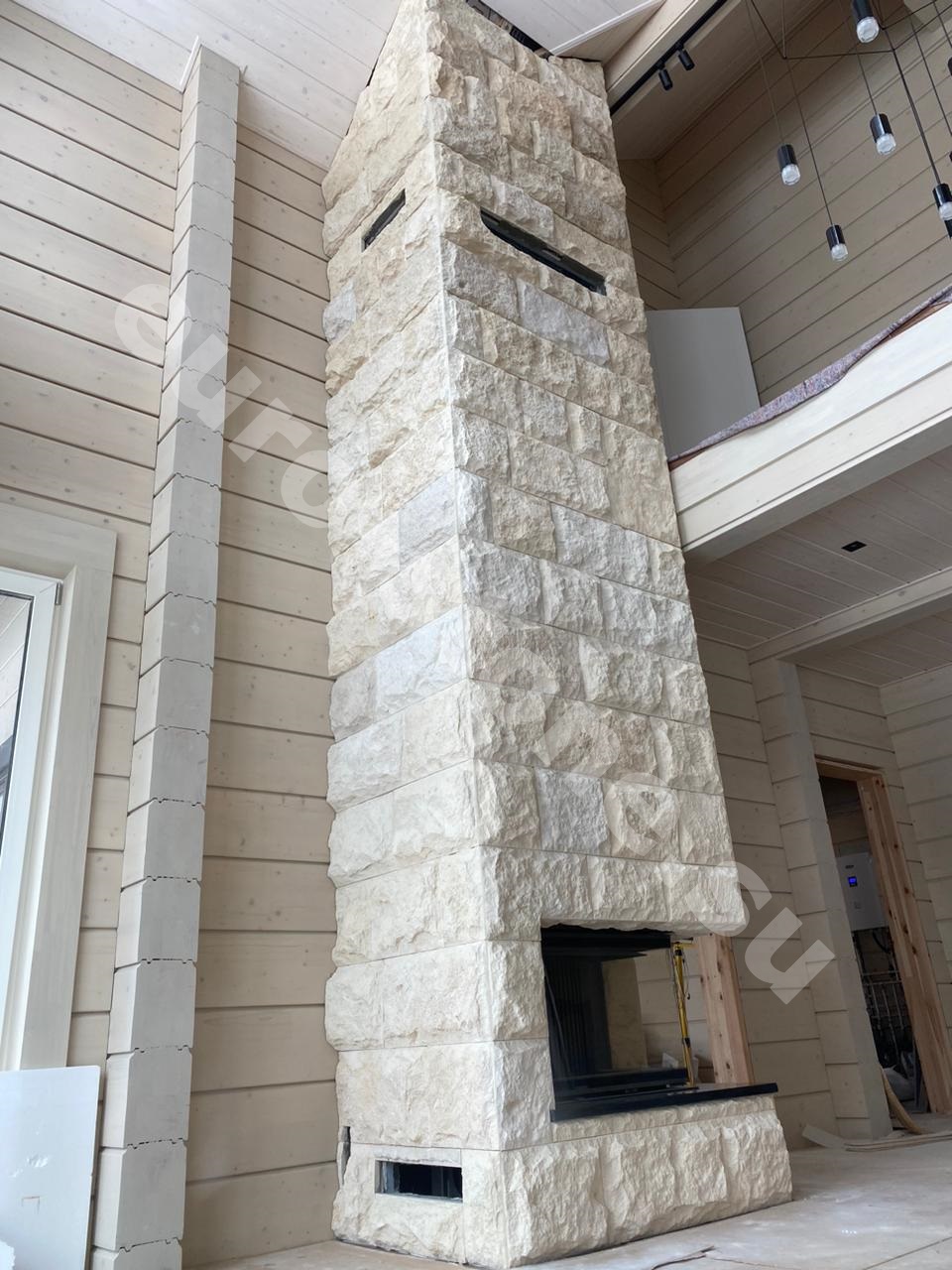 Колотый камень при облицовке камина создаёт эффект массивной кладки и живой природной текстуры. Такой камин смотрится солидно, при этом он долговечен и хорошо сохраняет тепло. Камень используется как в классических, так и в современных интерьерах.